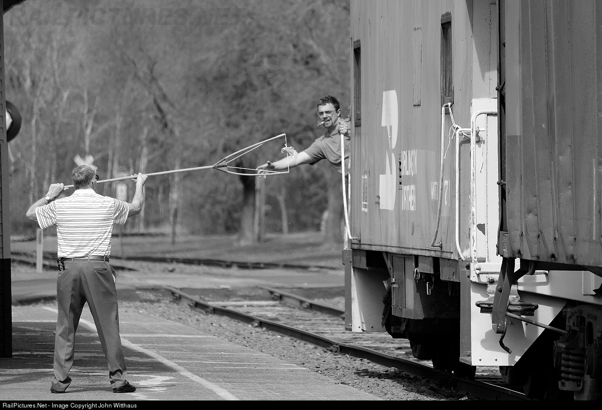 | Hoop 'Em Up!: There are some things in railroading that have been lost to time. Hooping train orders to crews is one. With nothing to date this shot, this could have been the late 70's, a conductor on a BN ballast extra getting his orders from the agent at the caboose. Taken while off duty, wearing full PPE. |