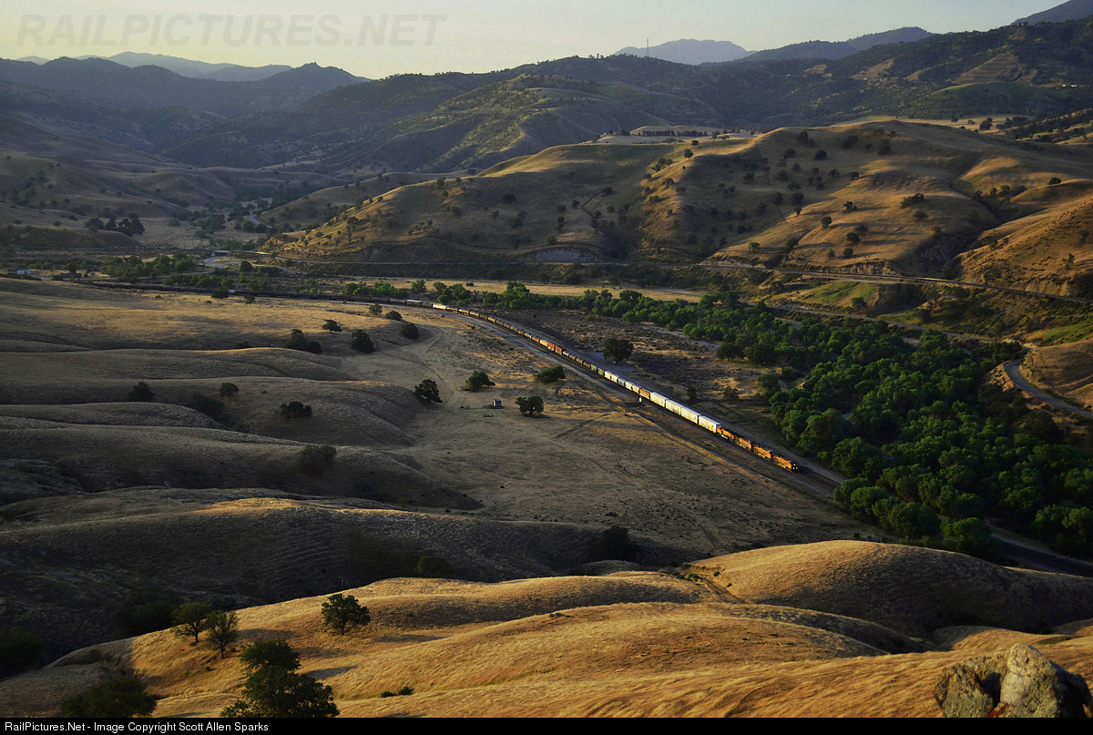 | The quietness of a spring morning, as the sun slowly peaks the hills, is disturbed by the high pitched whine of dynamic braking units working in unison to bring their train of mixed goods down the mountain and soon after into the San Joaquin Valley. The sun catches the side of the train while it drifts out of Caliente, approaching the short canyon to the west.