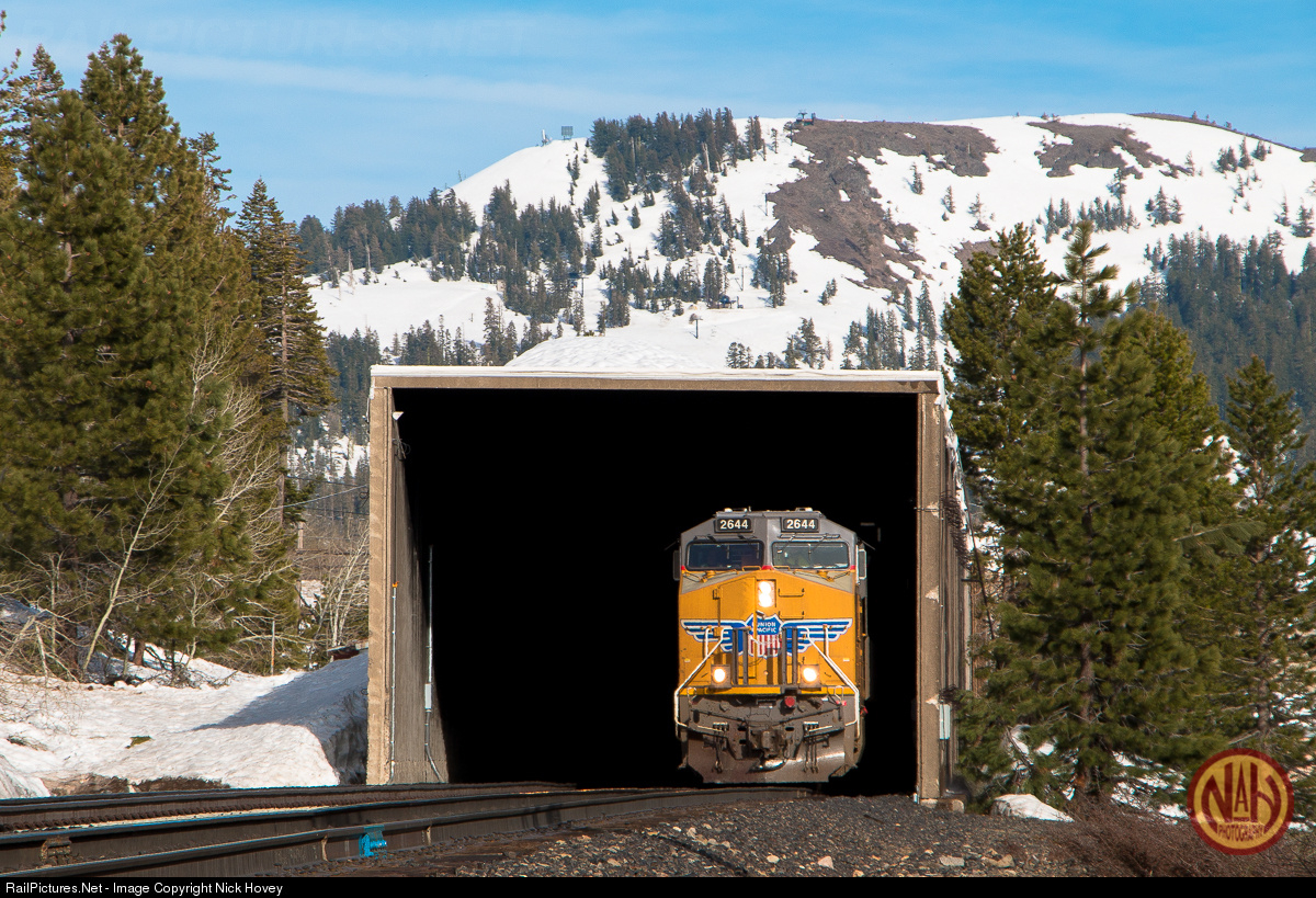 Popping out of the Norden snowshed into the late afternoon sun, a westbound intermodal train has crested Donner Pass and will soon battle gravity for the 40-odd mile descent to the California lowlands on National Train Day 2017.