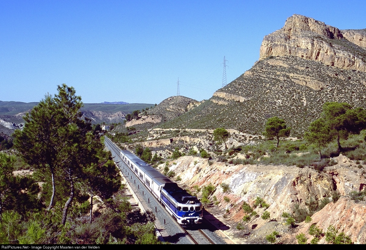 | Kraus-Maffei build RENFE 354 Class, especially designed for hauling the famous Spanish Talgotrains, was in 2008 at the and of its lifetime. Here the 354-001-0 "Virgen de Covadonga" is traveling through a rough mountainius section between Albacete and Murcia on its run from Madrid-Chamartin to Cartagena. |