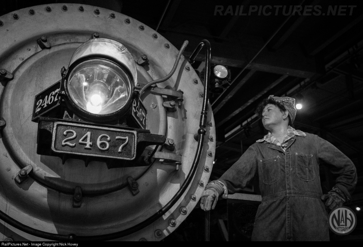 California, 1943- a female hostler has just finished tending to P-8 Pacific #2467 inside the Sacramento Roundhouse. Soon the husky Pacific will be backed out, serviced, and assigned to a troop train bound for San Francisco. In reality, the hostler is a mannequin, and 2467 is on loan to the California State Railroad Museum from the Pacific Locomotive Association. 2467 is stored serviceable, having made an appearance in steam at Railfair '99.