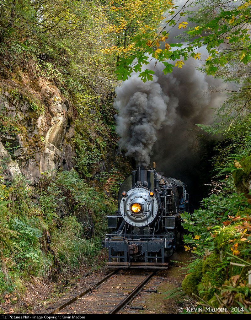In a cavern, in a canyon..... Crossett Western #10 exits the 300 ft long, curved tunnel near Mouton Falls, and is seen here among the dense vegetation in the rock cut that marks the approach to the West Portal.