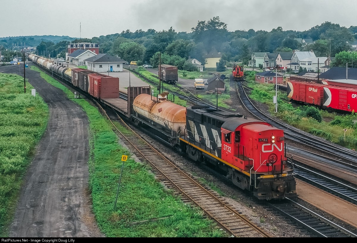 A Canadian National RS18 growls through Brockville, Ontario with an eastbound peddler. Meanwhile, the SW1200RS working the station area has dropped a box car on the team track, and is now taking a gondola elsewhere. The semaphore protects the track that it is occupying, which leads to a a short tunnel under the CN main west of the station. Beyond that is a wye for the VIA power from Ottawa to turn. Today, Ottawa trains continue to Toronto, obviating the need for a wye, and nothing beyond the CN main lines remains.