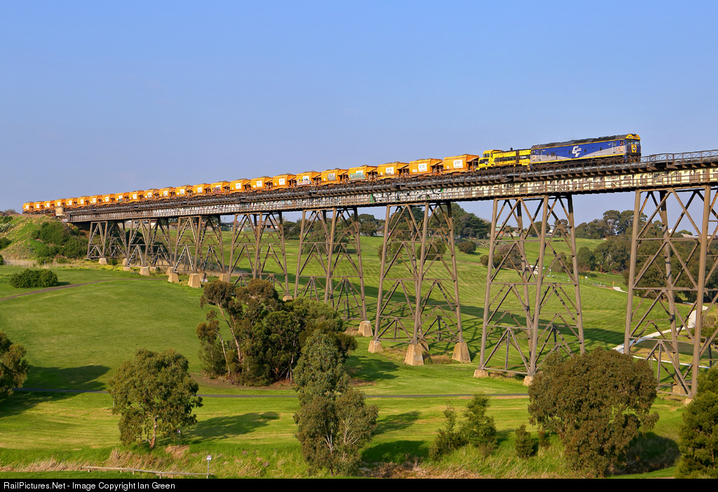 G512-T386 haul 9342 loaded quarry freight across the Moonee Ponds Creek viaduct near Glenroy.
