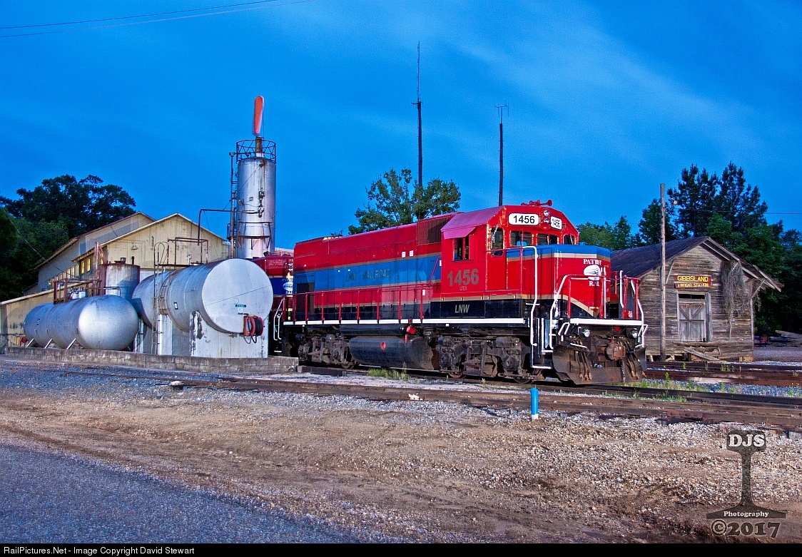 | Gibsland, Louisiana at 06:43 on May 17, 2017 finds Patriot Rail's Louisiana & North West GP15 1456 standing ready for the day's work. Long gone are the times of the F units which made L&NW a hit with fans years ago. At least we can still see this down home scene complete with the aged Freight Station. |