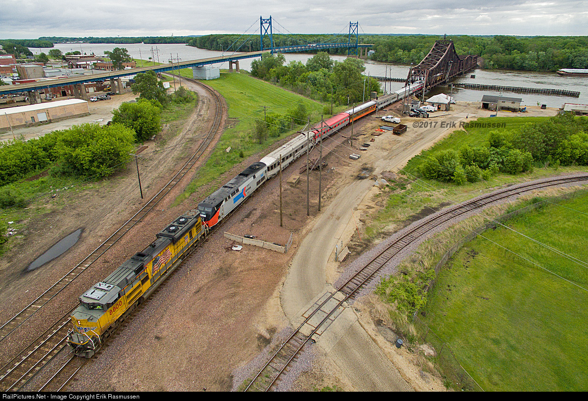 The AAPRCO Spring Meeting special passes over the Mississippi River into Clinton. The special is operating from Chicago to Kansas City via Clinton and the Spine Line. UP 8800 is required for cab signals on the former C&NW route.