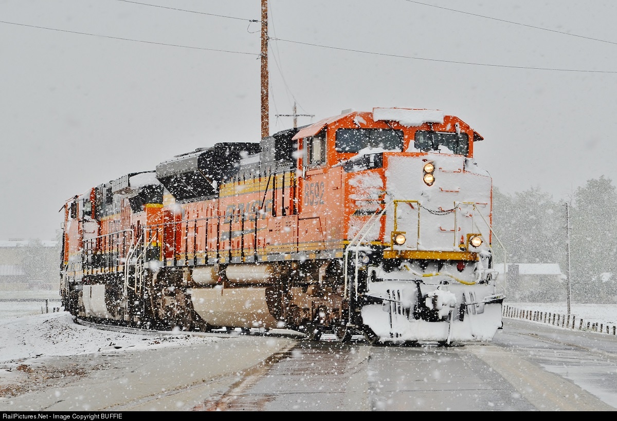 A heavy spring snow storm blankets Fort Collins, Colorado and BNSF 8592's nose as it heads into the storm.