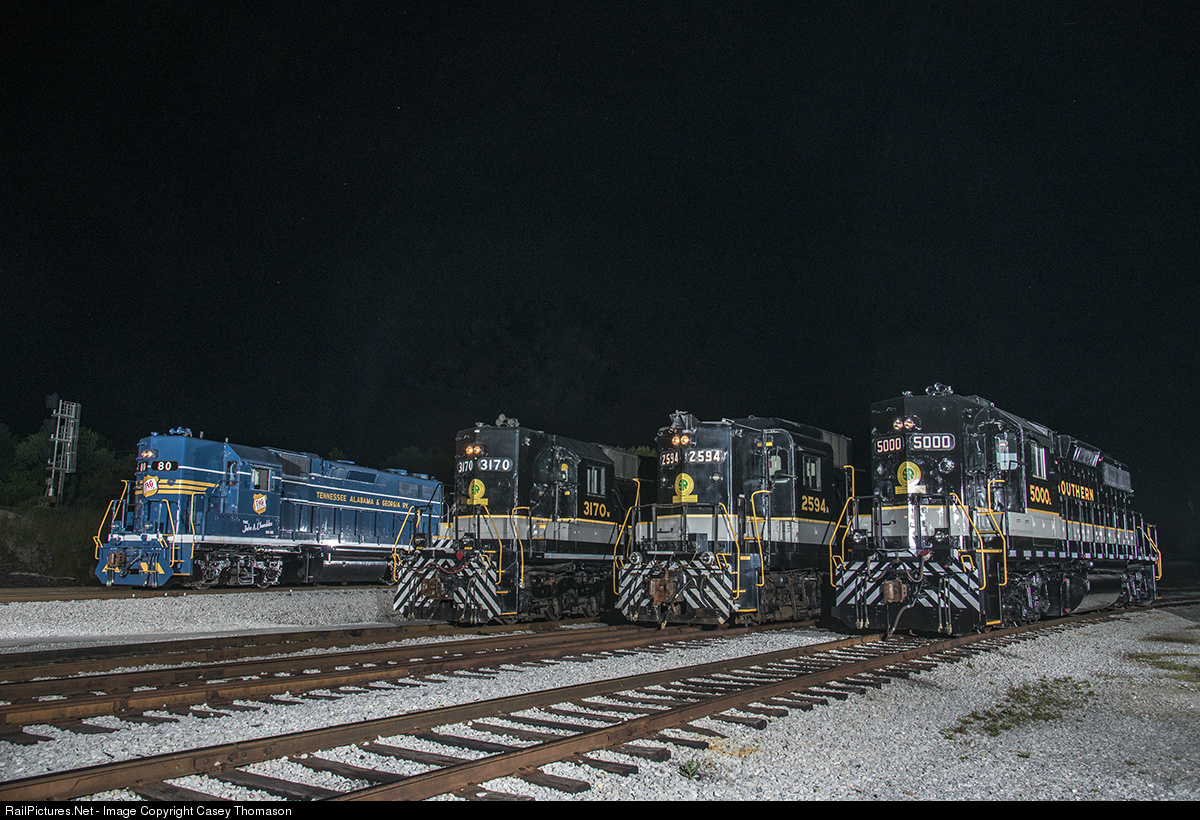 A high-hood gathering: Three Tuxedoes and a TAG at Grand Junction. (taken during the Southern Railway Historical Association's night photo session at Tennessee Valley Railroad Museum's "Grand Junction" in Chattanooga)