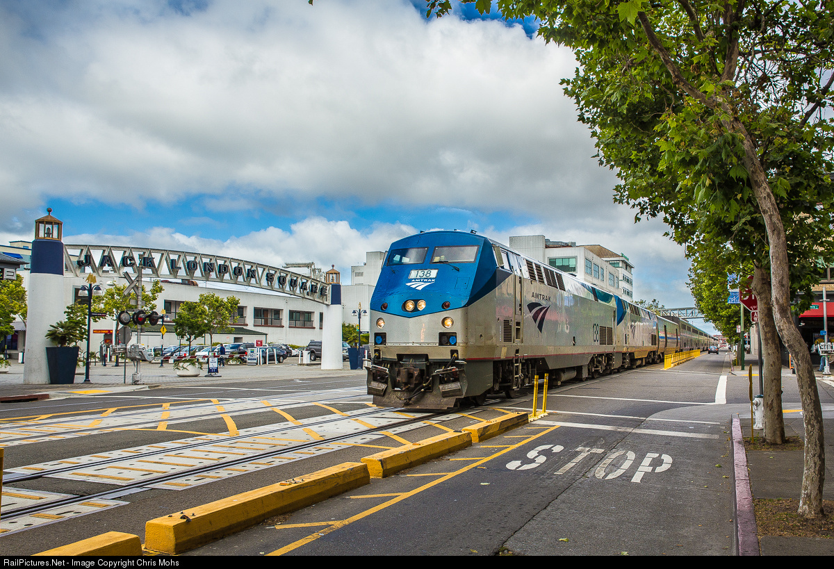 | Amtrak no.11 the southbound Coast Starlight has just left the Jack London Station and rolls down the street on the Niles Sub. Jack London Square is named for the famed Jack London, an American novelist, journalist and social activist of the early 20Th century. |