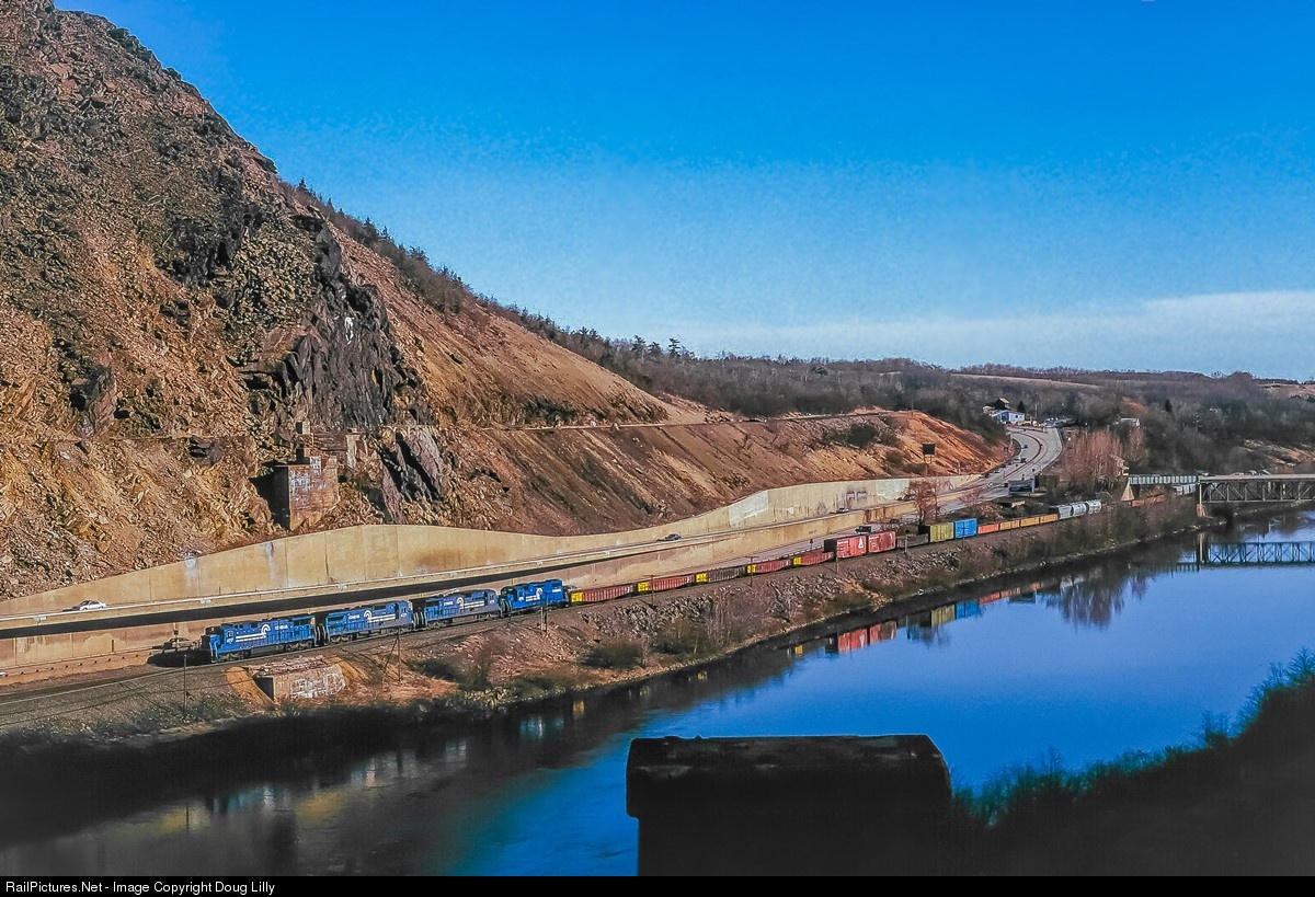 Reflected in the relatively still waters of the Lehigh River, Conrail train OICG (Oak Island – Corning) rolls through the Lehigh Gap, which once hosted three mainline railroads. The train is on the one-time mainline of the Central Railroad of New Jersey, the sole survivor of the three. The photo is taken from the western approach to the Lehigh and New England’s landmark bridge across the Gap, with a bridge pier visible in the foreground. The L&NE shut down in 1961, and the bridge was demolished six years later. Out of sight below the vantage point was the Lehigh Valley main line, which was torn up in the 1980’s.