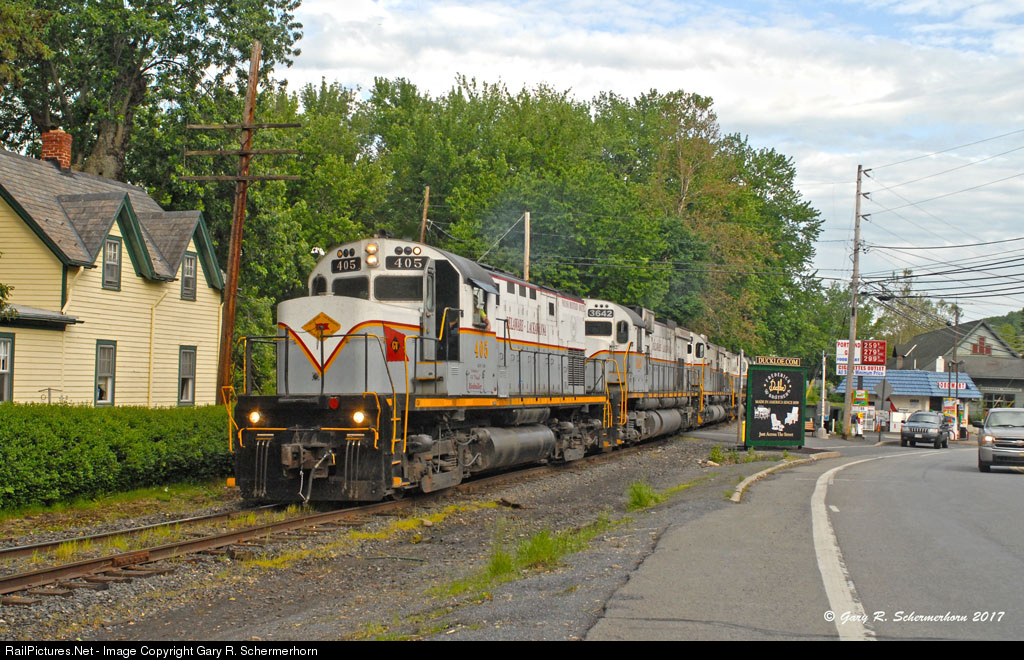 | An interesting full day for the crew of the PT97 seen here departing town along Route 611 at Delaware Avenue with the NS H76 interchange. Earlier the crew with a nice five unit set of corporate schemed Centuries in five different models(C420/C636/M630/C425 & M636) took some heavy sand cars over the Poconos into Nay Aug Yard in Scranton and returned as PT98 to spot cars at Mount Pocono and make a drop to Bestway Lumber in Cresco befrore returning to the Gap for another interchange pickup. |