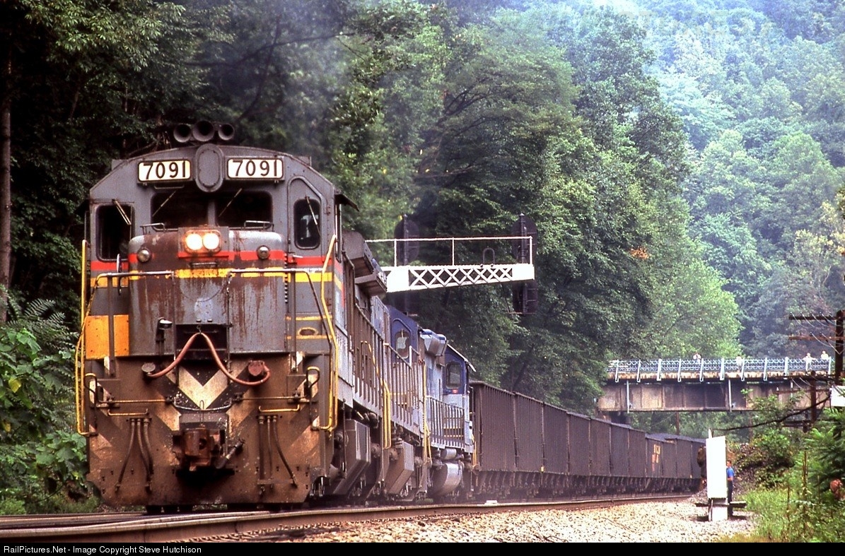 | Lead by a rough looking Seaboard C30-7, 7091, an eastbound coal train crosses from main one to main two at Cotton Hill deep in the New River Gorge. |