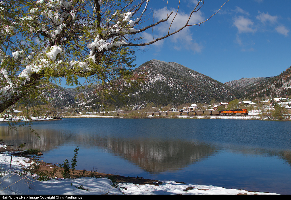 | BNSF 8763 leads a northbound coal empty around a picturesque scene in Palmer Lake, CO. A late-season snow storm dropped a bunch of fresh snow over the previous couple of days making for an odd contrast with the budding leaves of Spring... |