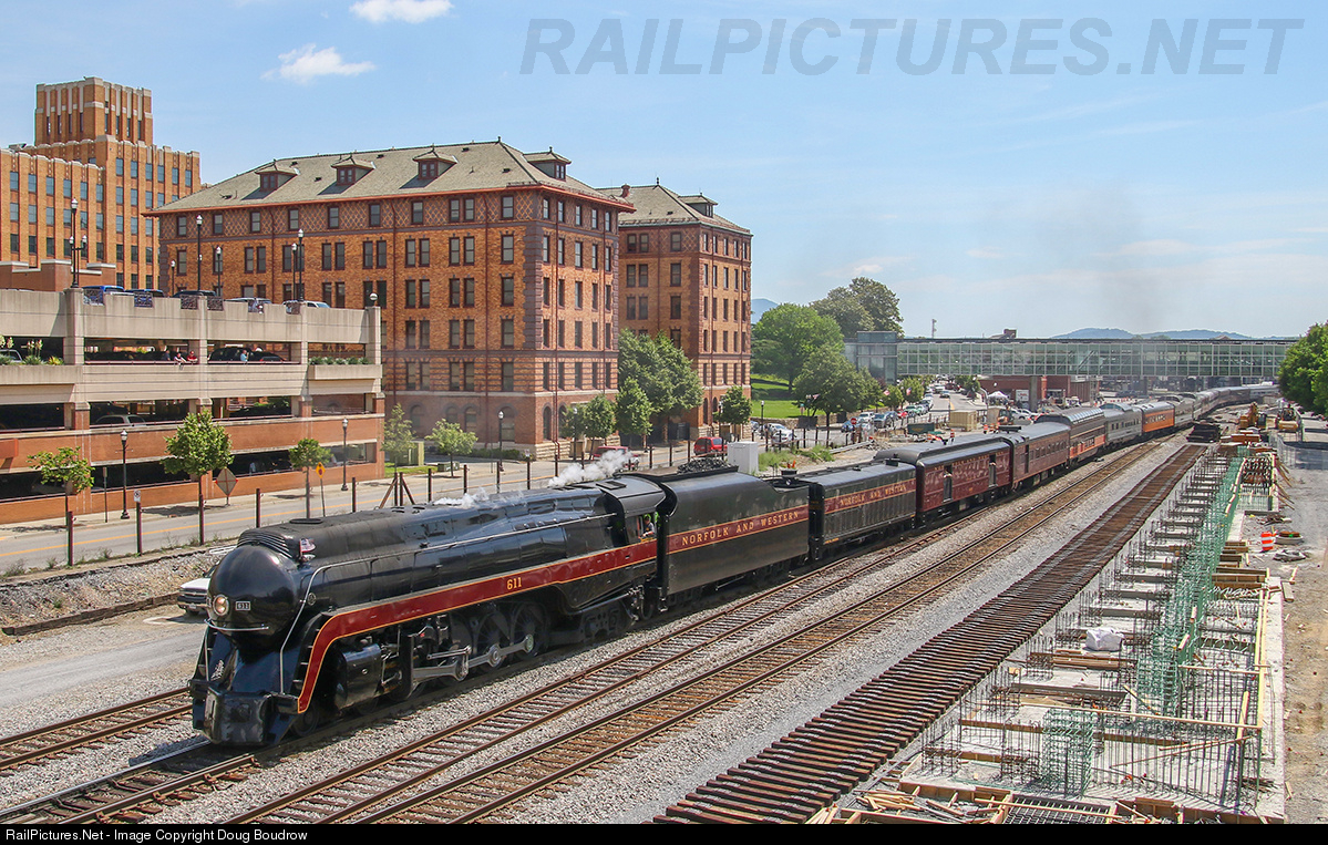 | N&W 611 brings "The Powhatan Arrow" into Roanoke with the original Norfolk & Western headquarters building (now apartments) in the background. The construction in the foreground is progress on the new Roanoke Amtrak Station which if happens as planned will restore passenger service to Roanoke. |