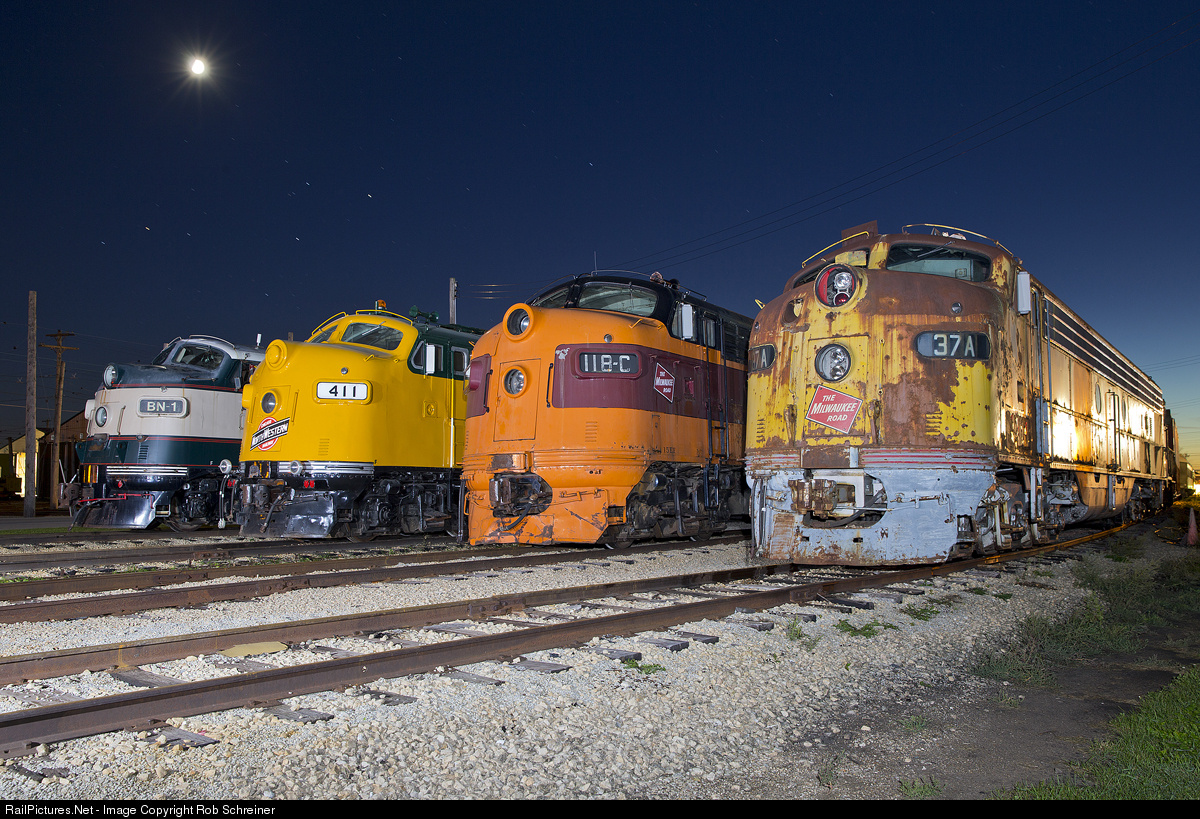 During Diesel Weekend 2015, this line up was displayed in yard 5. Here three F-units and one E-unit shine under the moon and stars, and the last of the blue hour too. Currently the MILW 37A is in the shop for cosmetic refurbishment, from the rear of her cab, forward.
