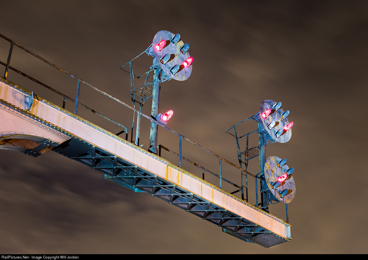 | All reds are shown on the Norfolk & Western era cantilever at Webster, indicating no trains on the Blue Ridge District on this tranquil May night. |