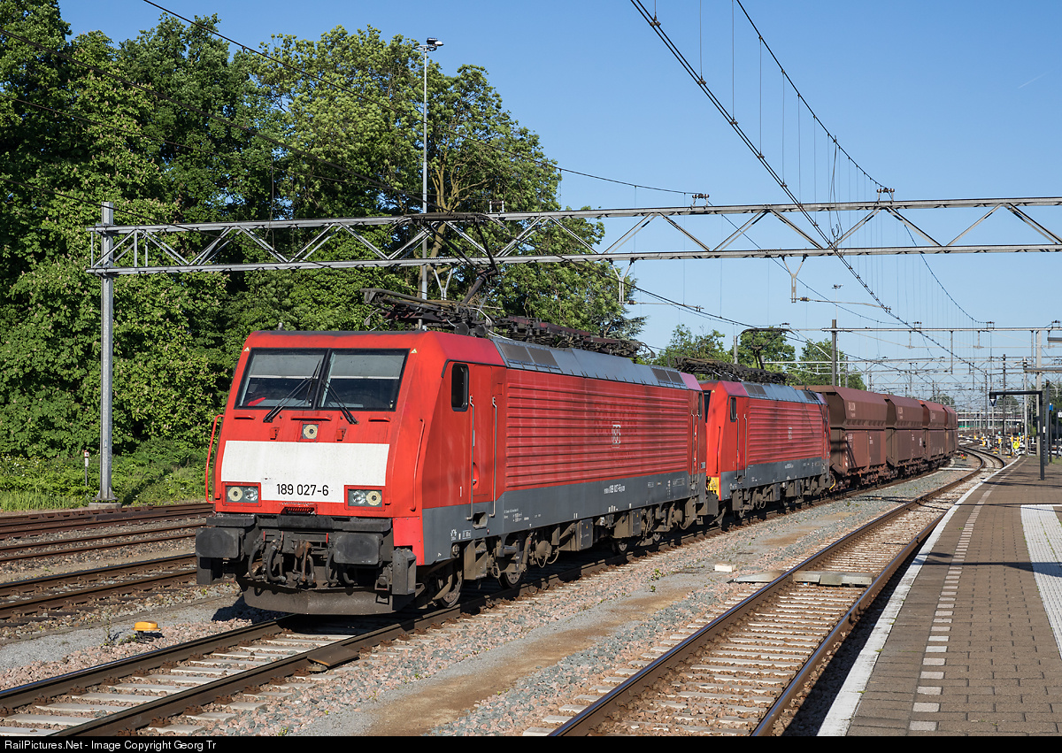 | Locomotives 189 # 027 and 034 of the DB AG (Siemens ES 64 F4) are pulling a heavy 5500 ton ore train with 40 sixaxle cars Falrrs, fitted with automatic couplers, from Rotterdam Maasvlakte through Dordrecht towards Venlo to Dillingen/Germany. |