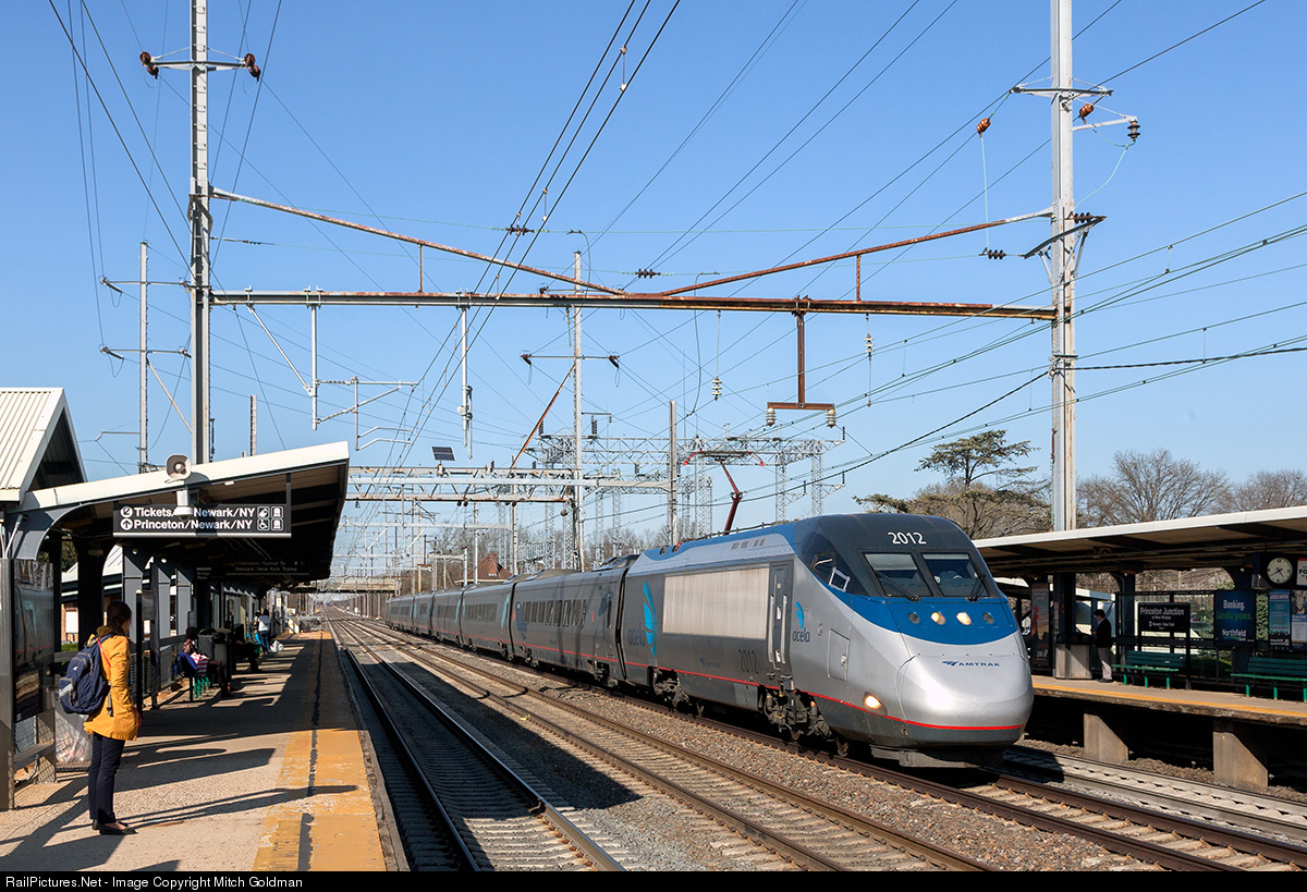 Amtrak's Acela Express roars through Princeton Junction on what is normally the northbound (Amtrak eastbound) express track late in the afternoon in mid-March of 2017, the year the project was expected to be complete. The project will eventually see speeds of up to 160 mph along the stretch of track between New Brunswick, NJ and Trenton. Track 3 to the left was taken out of service while new constant tension catenary supports and wire - visible above the platform canopy - are installed.