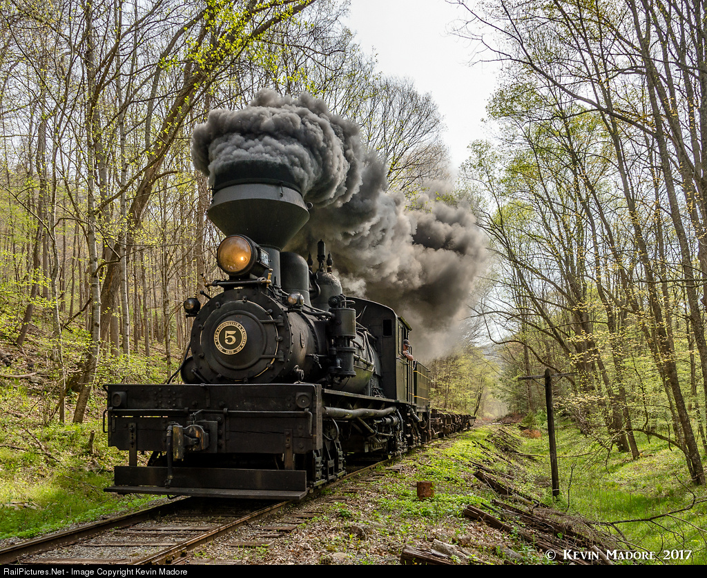 Durbin to Cass by rail. Cass Shay #5 runs southbound toward Cass on the old C&O Durbin Branch, with a set of empty log flats. Can you really go from Durbin to Cass by rail? Well, not just yet, but the wheels are in motion to restore this connection, after nearly 30 years of dormancy.