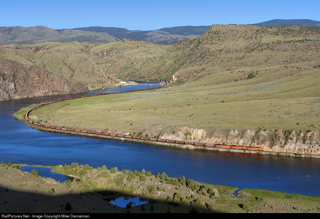 An eastbound BNSF coal train snakes along the Missouri River through Lombard Canyon between Toston and Lombard, Montana, late in the afternoon of June 25, 2016. Three “elephant-style” EMD SD70ACes power the empty up front, followed by a single ACe pushing on the rear. Toston Dam is in the background near the rear DPU.
