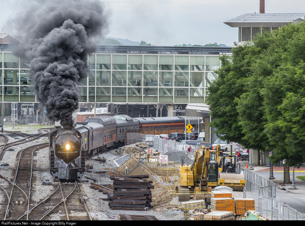 | After dropping off the passengers and turning the wye at Campbell Avenue, the N&W 611 leads 958 West out of the wye and back into the yard to tie their train down before the next days excursions. The new Amtrak platform is being constructed on the right side of the frame, with Amtrak service returning to Roanoke in the fall. |