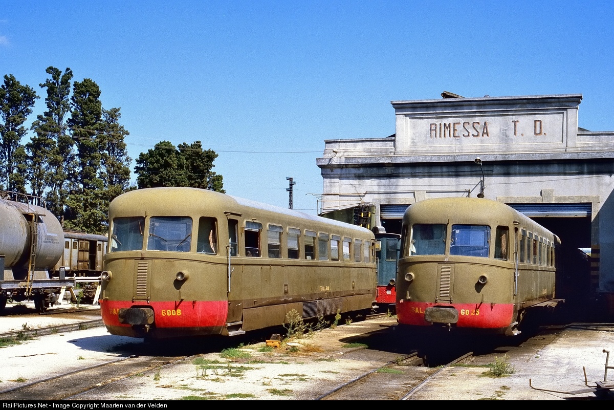 | FS RALn 60.08 and RAln 60.25 before the shed at Catelvetrano (Sicily). Thes railcar were used on the narrow gauge line from Castelvetrano to Sciacca. |