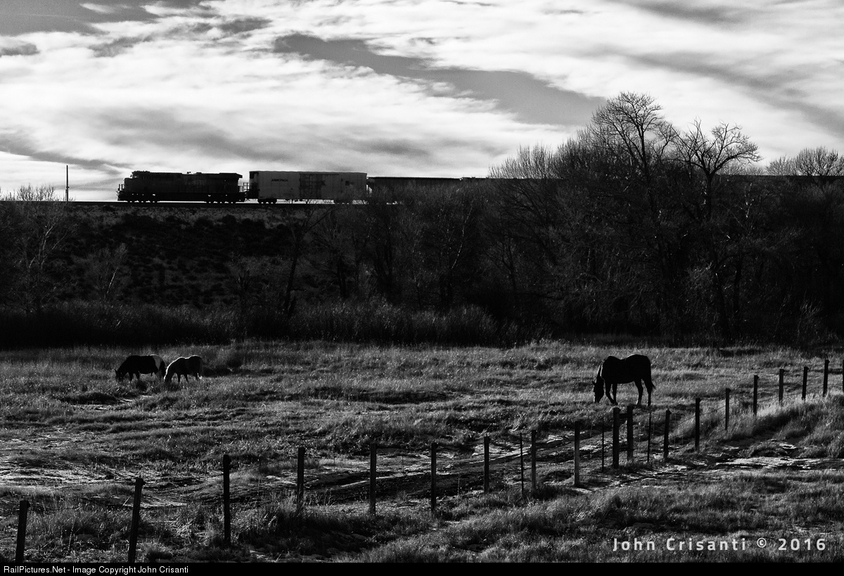 A couple of horses enjoy the grass in a small field as a westbound Union Pacific manifest races into the small town of Rock River, Wyoming on November 19, 2016, on the Laramie Subdivision.