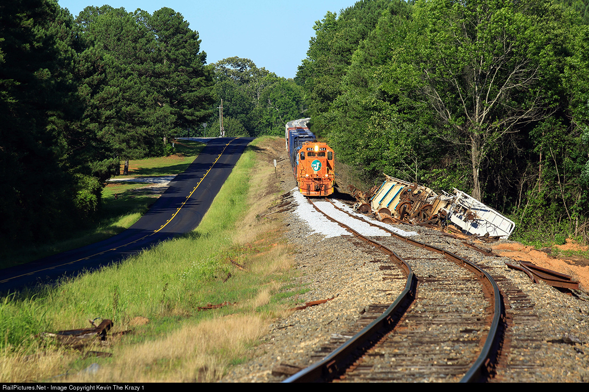 3 of the 5 cars that derailed back in January are still laying on their sides as the former J SD38 leads a northbound train for the NS at Toccoa.