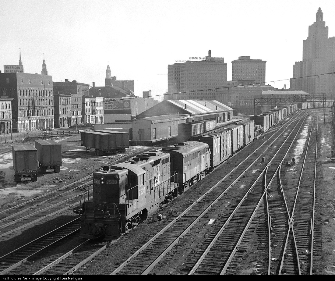 | With downtown Providence in the background, a GP9/FA1 pairing of two former New Haven diesels that have been renumbered but not repainted hauls an eastbound Penn Central freight towards Northup Avenue Yard. In 1986 the Northeast Corridor mainline was relocated to the right of this photo, and this area was cleared of tracks to allow commercial development. |
