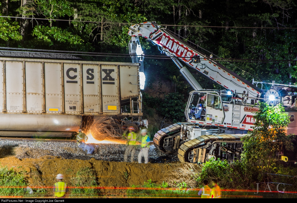 With the end of the loaded coal car supported fully, a welder begins cutting away the defective rail below as work continues into the night to get the branch line back open.