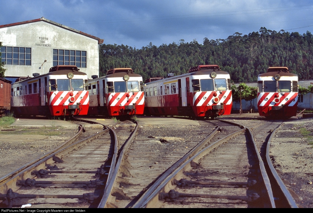 CP 9303, 9301, 9307 and 9308 before the shed at Sernada do Vouga. These motorcars were build in the Netherlands by Allan in Rotterdam. Later they were modernized by the CP by replacing the diesel engins by new Volvo engins.