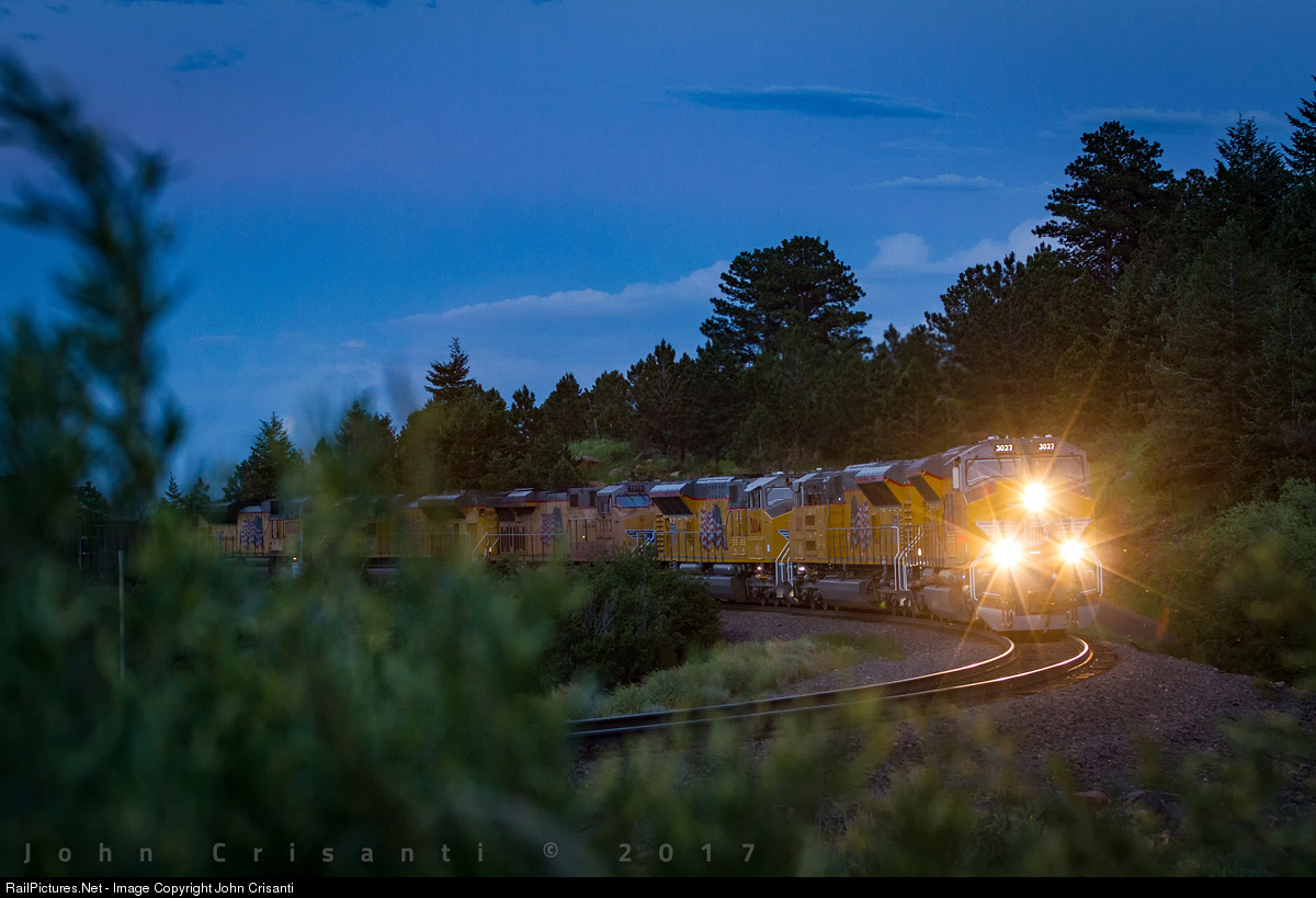 The sun is gone for the day as Union Pacific SD70ACe-T4 Nos. 3027, 3019, 3014 lead three more UP units on the North Yard-Roper Yard manifest up the 2-percent grade into Coal Creek Canyon near Arvada, Colorado on June 14, 2017.