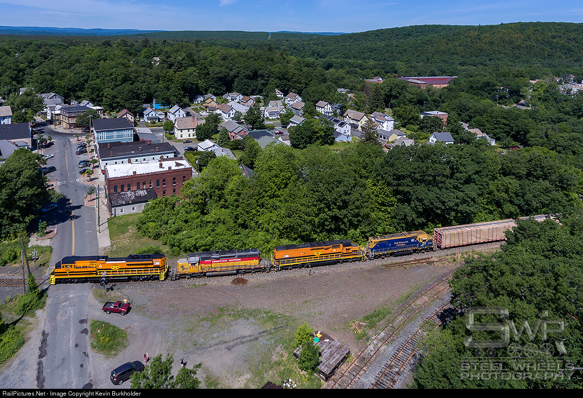 New England Central Railroad's train 611-14 turn rolls through Millers Falls, Massachusetts, with Providence & Worcester SD70M-2 4302 leading 'Kodachrome' Connecticut Southern SD40-2 3771, NECR SD40T-2 3317 and NECR GP38 3845 leading the Palmer, MA-bound freight. This would be the maiden run of the P&W SD70M-2 after being repainted in St. Albans, VT.