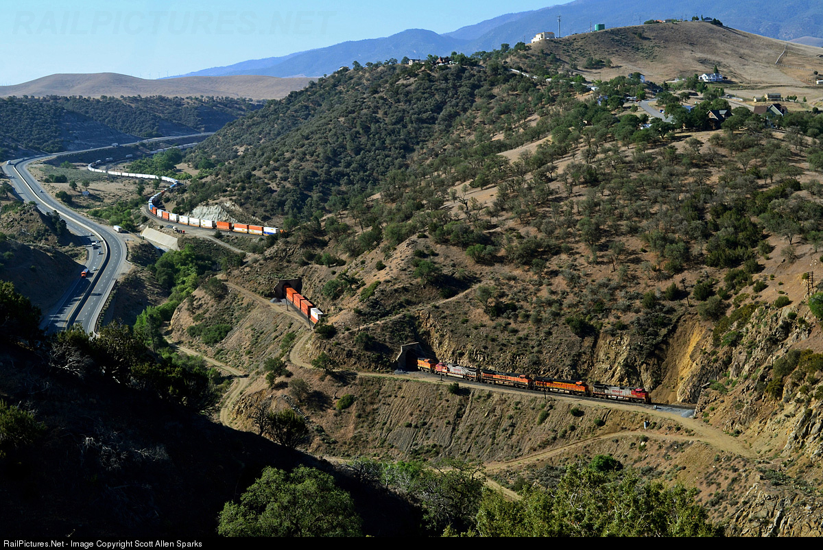 | Led by red and silver, this BNSF intermodal drifts down grade through Tehachapi's tunnel district, where tunnels 17, 16, 15 and 14 lie. |