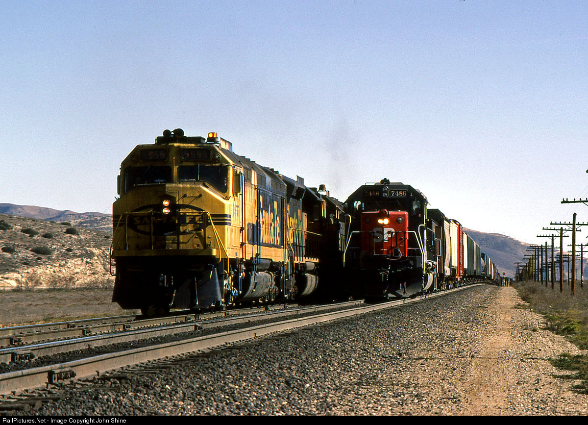 As Southern Pacific SD45R #7486 shoves on the caboose on the rear of an Eastbound train, Santa Fe F-45 #5955 passes by heading Westbound.