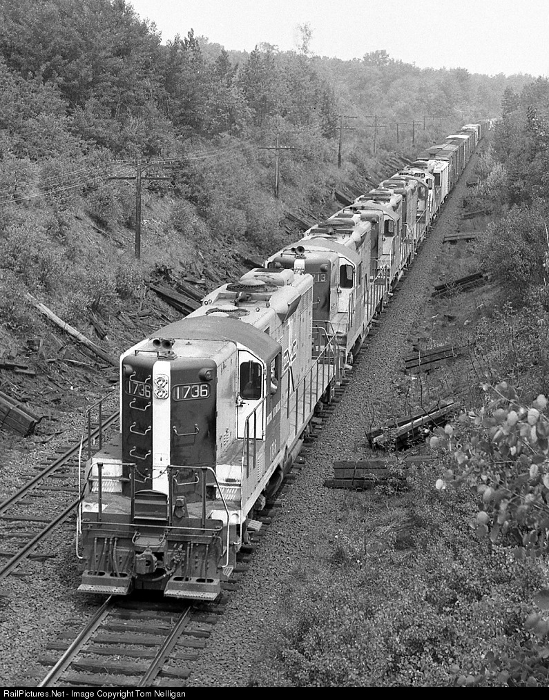 An impressive lashup of five GP9s and a GP18 lifts Boston & Maine train RM-1 (Portland, ME, to Mechanicville, NY) up the hill at Shelburne, MA, as it climbs out of the Connecticut Valley and into the heart of the Berkshires.