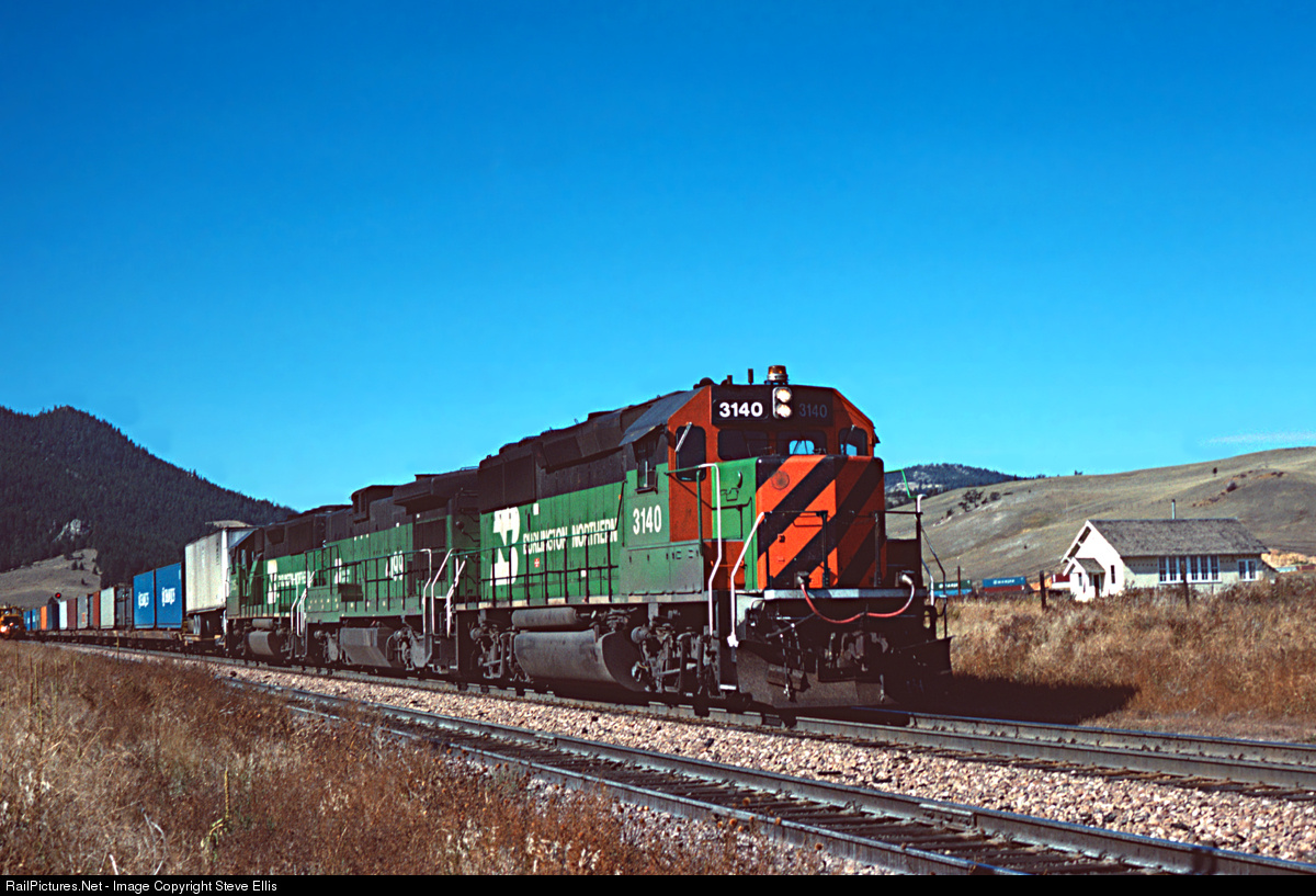 | GP50 3140 with it's tiger stripe nose, with a B30-7 and another GP50 are in charge of a hot trailer train on the Ex Northern Pacific track-age. |
