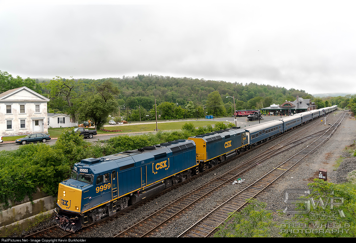 CSX Transportation's deadheading office car special train P900-15 is seen eastbound early in the morning at Palmer, Massachusetts, on June 17, with F40PH 9999 and 9998 leading the 11 car train that is set up in reverse for next week's trip to Chicago out of Boston, MA.