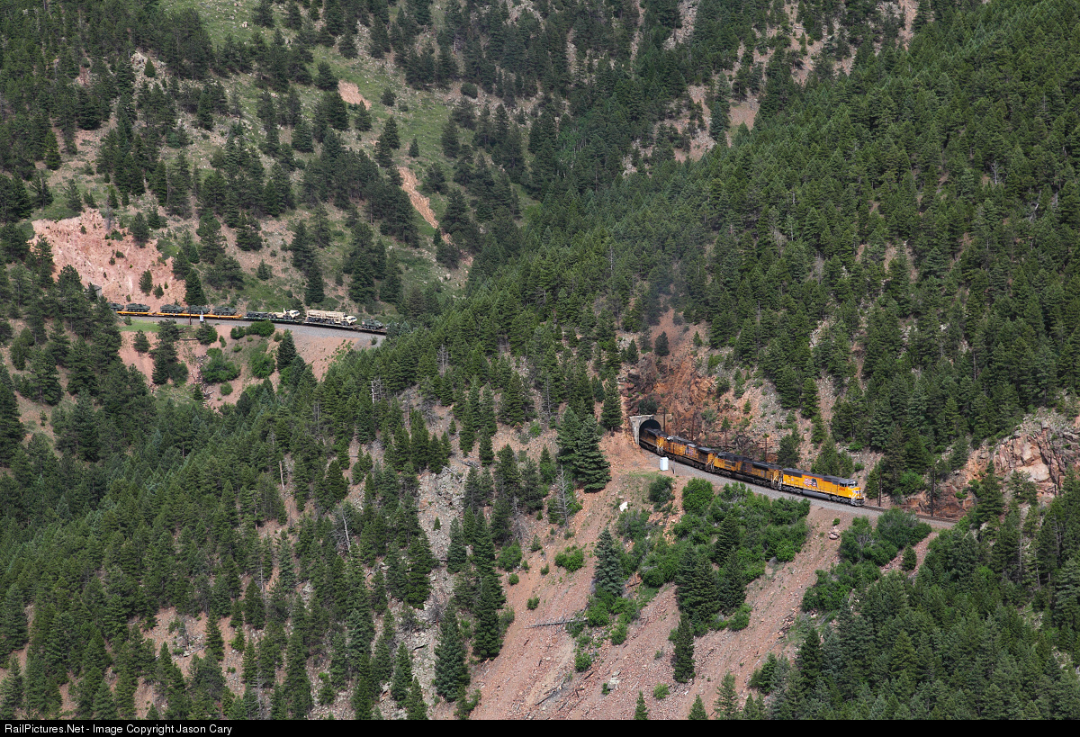 A freshly repainted SD70M leads a heavy trainload of Strykers and support vehicles up the heavy 2% grade in South Draw. The railroad in South Draw is a large horseshoe curve blasted into the contours of the canyon with numerous tunnels and cuts. The train is deep in the heart of DRGW's Tunnel District, and South Draw, as it bursts out of Tunnel 13