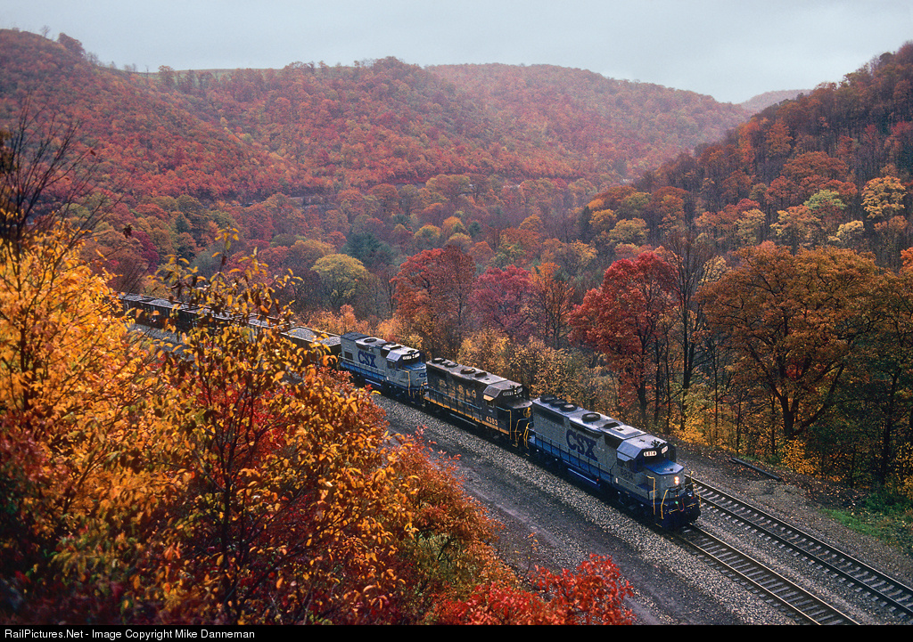 | A heavy westbound CSX freight climbs the grade up Sand Patch at Mance, Pennsylvania, on the colorful autumn day of October 22, 1988. |