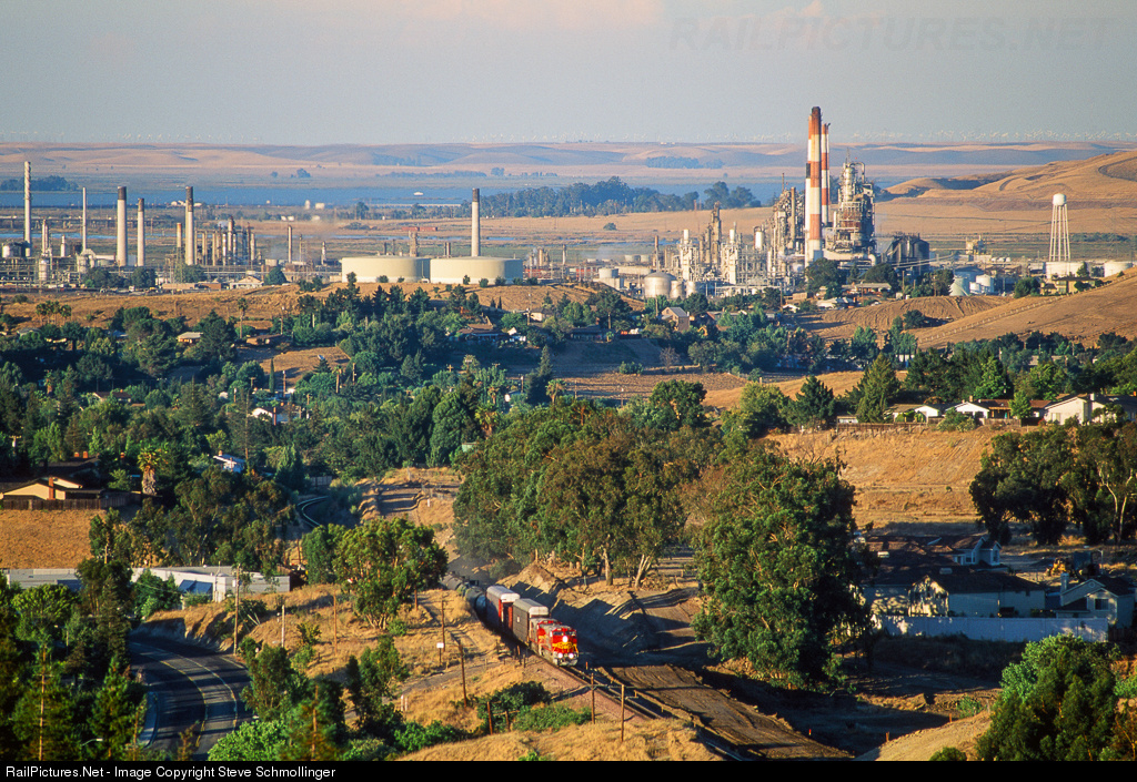 Late on a sunny afternoon, a Santa Fe freight that left many of it cars in yards en route, climbs the foothills through Martinez toward Franklin Canyon. In the distance are the big Tosco Oil Refinery and Monsanto Chemical Complex. Beyond that is Suisun Bay.