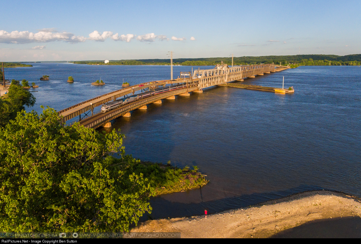 | Amtrak heritage unit 184 leads The Southwest Chief across the swing bridge that spans the mighty Mississippi River at Fort Madison on a gorgeous summer evening. |