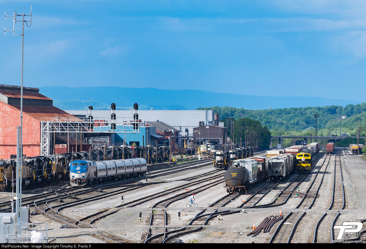 Amtrak's Pennsylvania pulls up to WORKS in Altoona, but not without a near-miss. The boy on the bicycle in the middle of the frame is one of several trespassing kids that were nearly struck by the Pennsylvanian. They're all unhurt, but the one shown here decided it was best to run back the way he came. A white SUV showed up a few minutes later looking for them...