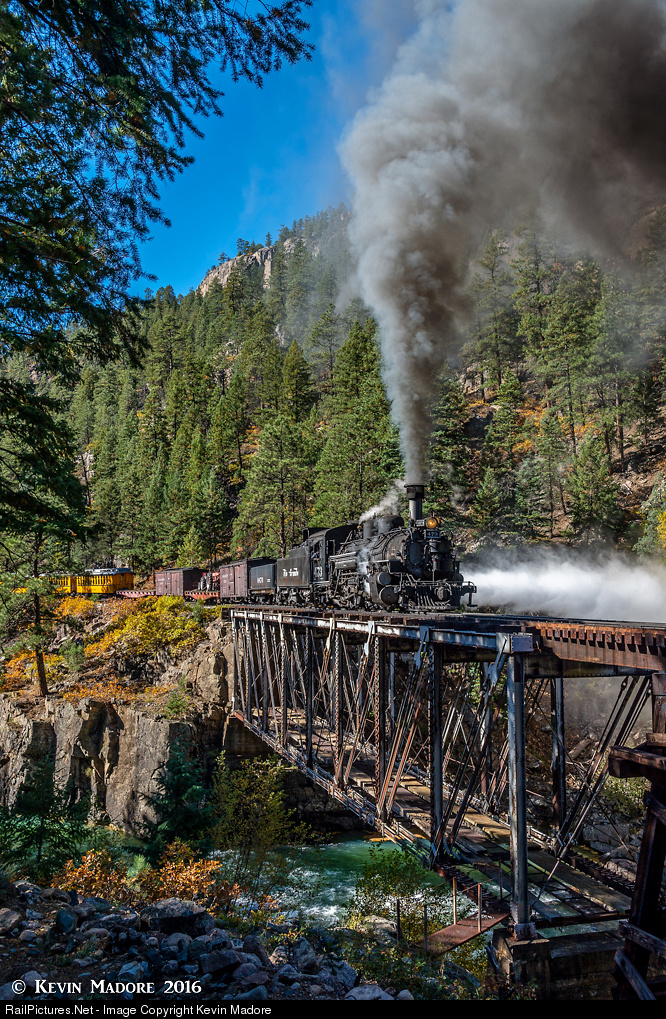 The High Bridge at Tacoma is a wrought-iron deck truss, which has been at this location since 1894. When first built, this bridge was designed to hold the small, inside-frame Consolidations that were the standard power at the time. Although able to hold some of the larger K-class Mikados, such as the K-27 and K-28 (pictured here), that was about the limit of the original design. When the line was sold to Charles Bradshaw in 1981, the newly-formed Durango & Silverton Narrow Gauge Railroad added considerable bracing to the existing design, to strengthen the bridge and allow it to carry the heavier K-36 and K-37 Locomotives that would be become the workhorses of the new tourist operation. Some of those "modifications" become pretty obvious when you stand at this location and study this century-plus year-old bridge. Oh, and needless to say, there's a slow-order here too.