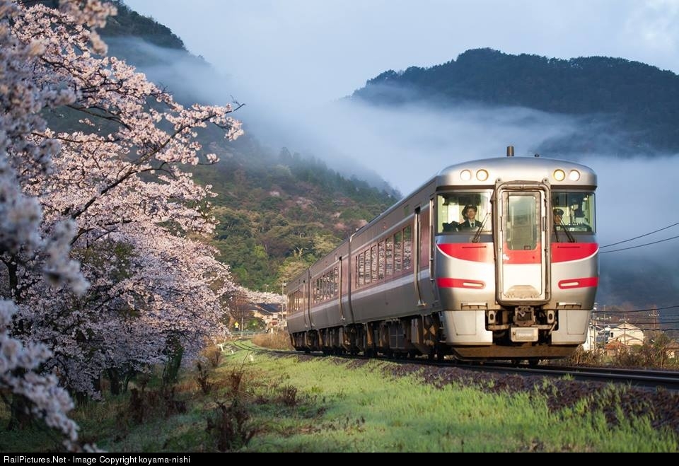 kiha189 is heading mornig sunshine through cherry blossam of Oiwa station.