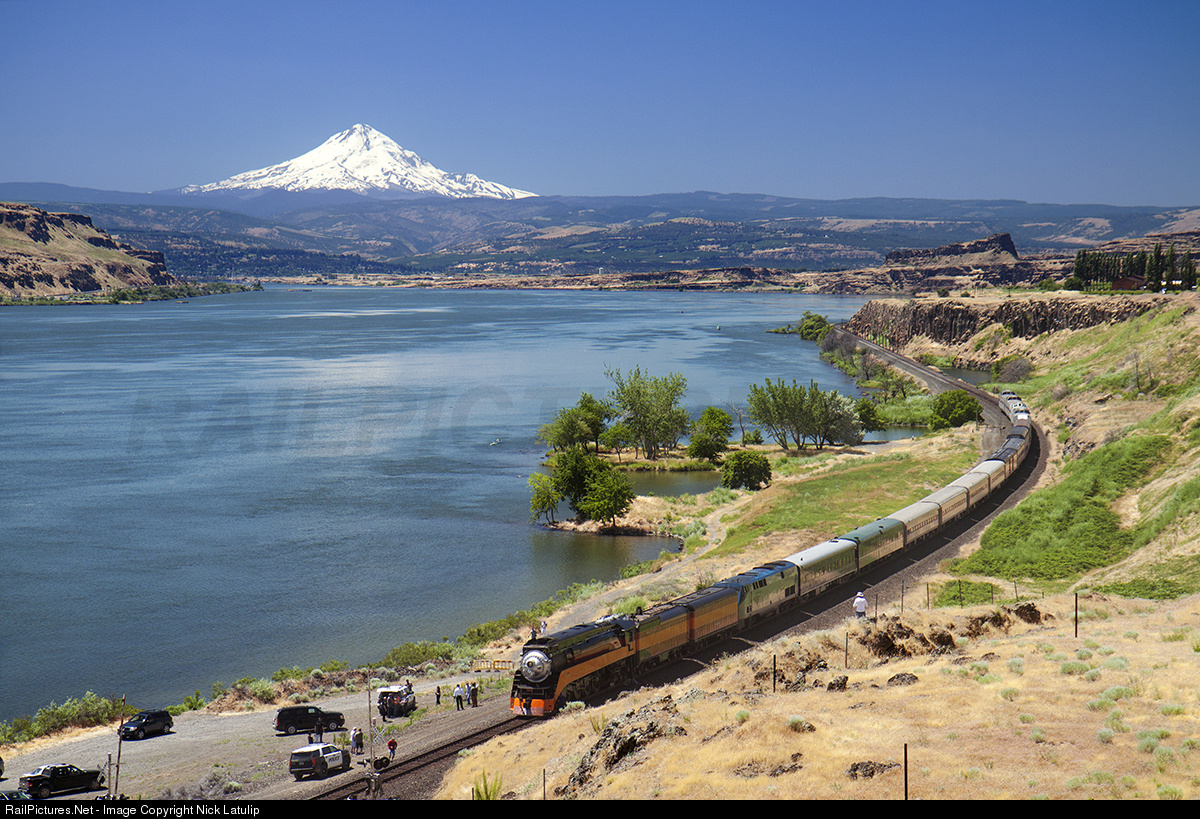 | Friends of SP 4449 excursion from Portland, OR to Bend, OR pauses for a moment in the gorge, which luckily allowed us to catch up and get a shot with Mt. Hood in the background. After this brief stop they will cross over the Columbia River and back into Oregon. |