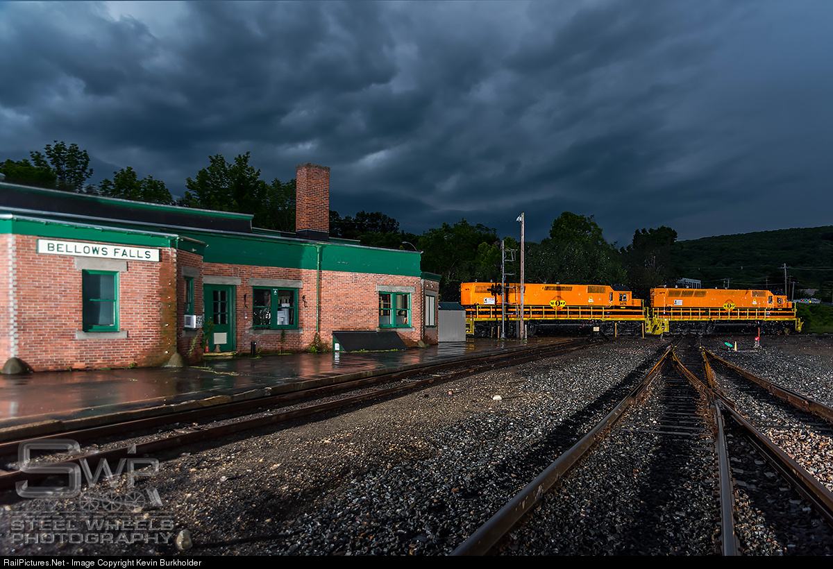 New England Central Railroad SD40M-2s 3474 and 3475 lead northbound train 323-26 past the Bellows Falls depot and over the Green Mountain Railroad Bellows Falls Subdivision. A thunderstorm was moving in with rain already falling at the time of the photo. Illumination from trio of Alien Bees B1600 flash.