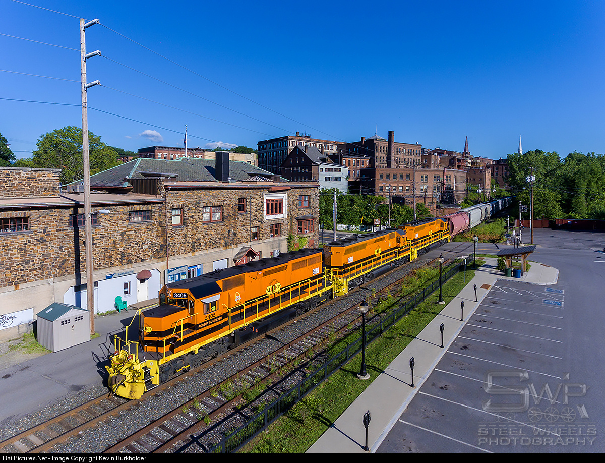 | New England Central Railroad SD40-2 3405 leads SD40M-2s 3474 and 3475 with southbound freight 324-25 as the train arrives in Brattleboro, Vermont. |