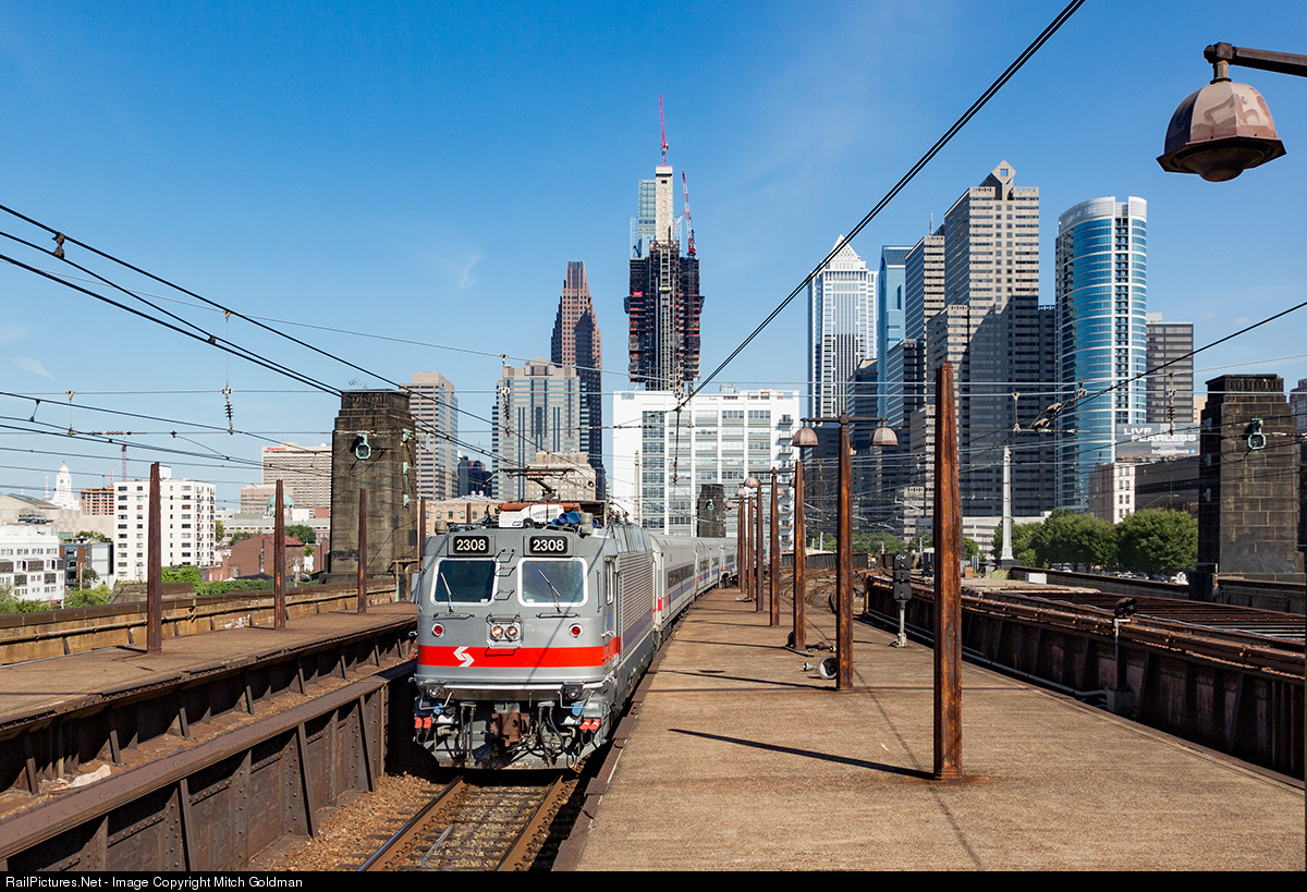 SEPTA's sole ALP-44, No. 2308, arrives at the upper deck of Philadelphia's 30th Street Station. The unit was one of 33 built by Asea Brown Boveri of Sweden between 1989 and 1997. Of those, 32 went to NJT, all of which were since retired making No. 2308 the last of its kind. Comcast's new skyscraper, the Comcast Technology Center rises in the distance. Towering in at 1,121 feet when completed in 2018, it will be the tallest building in the Western Hemisphere outside of Manhattan and Chicago.