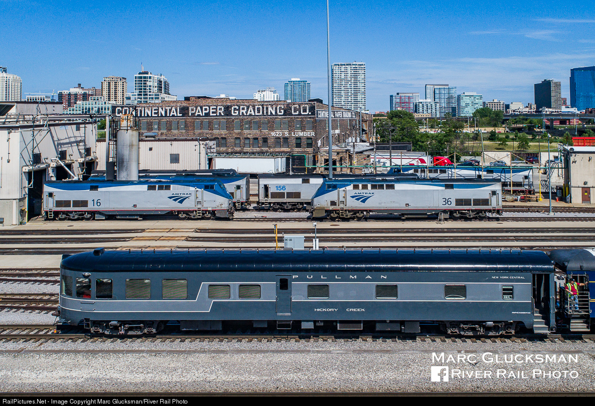 Welcome back to Chicago, Illinois! The former New York Central Railroad "Hickory Creek" (United Railroad Historical Society of NJ -URHS/Star Trak Inc) sits next to the Amtrak Engine Shop with the Continental Paper Grading Company building in the background. This car served Chicago on the 20th Century Limited for many years, and will carrying passengers on the "Joliet Rocket" on 6/17-18/2017, powered by Nickel Plate Berkshire 2-8-4 765.